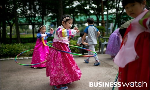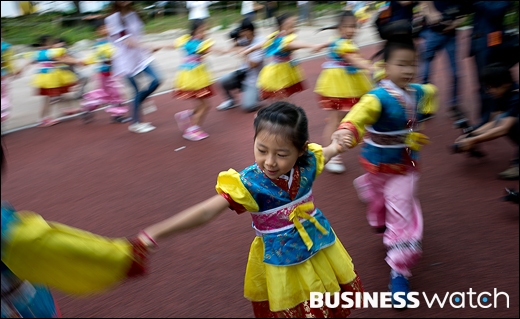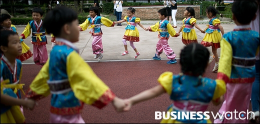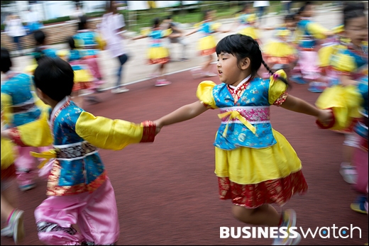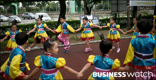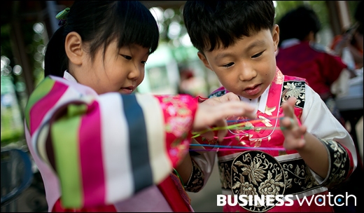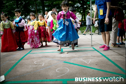 | ▲ 구로구 어린이들이 4일 오전 서울 구로거리공원에서 열린 ‘구로리 전래놀이 마을축제’에서 강강술래 놀이를 하고 있다. /이명근 기자 qwe123@ |