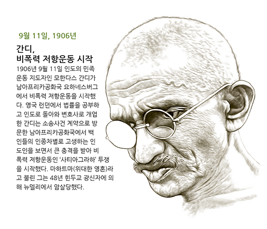 1906년 9월 11일 인도의 민족운동 지도자인 모한다스 간디가 남아프리카공화국 요하네스버그에서 비폭력 저항운동을 시작했다.