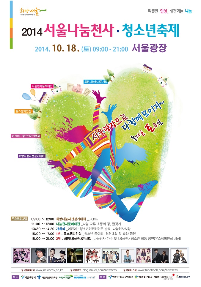 ‘2014 서울 나눔천사•청소년 축제’가 오는 18일 토요일 서울광장과 청계천 일대에서 열린다.