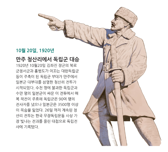 1920년 10월20일 김좌진 장군의 북로군정서군과 홍범도가 이끄는 대한독립군 등이 주축이 된 독립군 부대가 만주에서 일본군 대부대를 섬멸한 청산리 전투가 시작되었다.