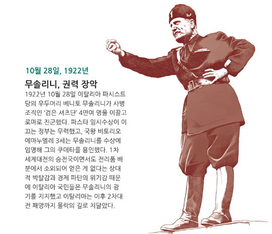 1922년 10월 28일 이탈리아 파시스트당의 우두머리 베니토 무솔리니가 사병 조직인 ‘검은 셔츠단’ 4만여 명을 이끌고 로마로 진군했다.