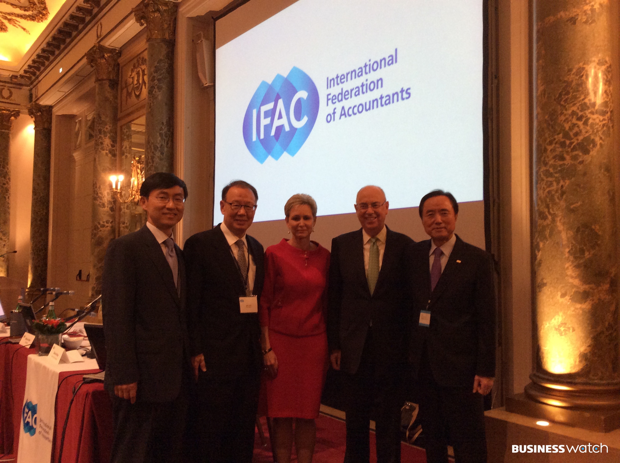 | ▲ 사진 왼쪽부터 안영균 부회장, 주인기 CAPA준비위원장, 올리비아 커틀리(Olivia Kirtley)IFAC 회장, 워렌 알렌(Warren Allen) IFAC 전임 회장 , 강성원 한국공인회계사회장. |