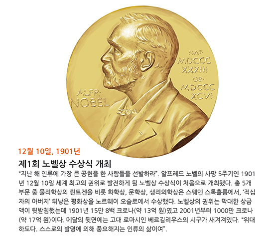 알프레드 노벨의 사망 5주기인 1901년 12월 10일 세계 최고의 권위로 발전하게 될 노벨상 수상식이 처음으로 개최됐다.