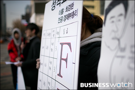 | ▲ 9일 오전 서울 광화문광장에서 열린 최경환 경제부총리의 경제정책을 비판하는 대학생 기자회견에서 대학생들이 최 부총리의 성적표에 'F'학점을 붙이고 있다. /이명근 기자 qwe123@ |