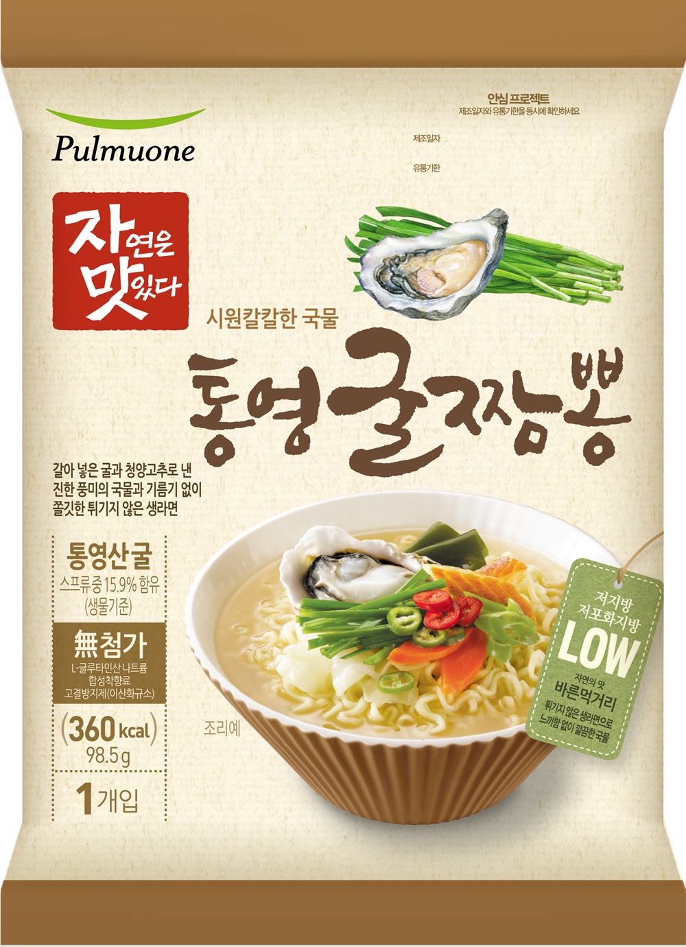 기름에 튀기지 않아 쫄깃한 면발에 굴의 진한 풍미와 청양고추의 얼큰함이 더해진 칼칼한 맑은 국물의 라면이다. 통영산 굴을 포함해 바지락∙오징어∙황태∙홍합∙조개∙백합 등의 7가지 해물을 우린 담백한 국물에 청양고추∙마늘∙양파 등을 넣었다.