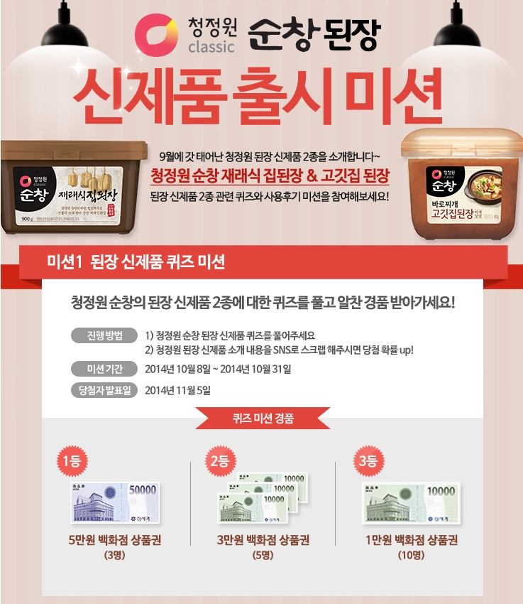 신제품 사용후기 미션도 함께 진행된다. 오는 11월 7일까지 사이트를 통해 미션 참여를 신청하면 이 중 50명을 선정해 신제품 된장 2종을 제공한다. 제공받은 제품을 활용한 요리 후기를 30일까지 개인 블로그에 올리면, 우수 후기자를 선정해 백화점 상품권을 제공한다.