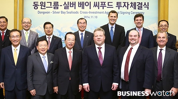 | 10일 동원그룹 본사에 열린 투자협약식. 박성칠 동원F&B 사장(아랫줄 왼쪽부터), 박인구 동원그룹 부회장, 김재철 동원그룹 회장, 트로이 덴킹저 실버베이 씨푸드 회장, 리처드 릭스 CEO, 로버트 주아니치 부회장. |
