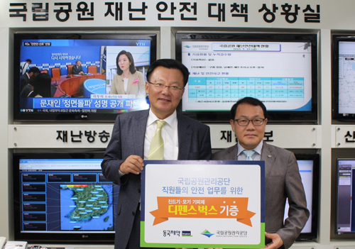 ▲동국제약은 지난 15일 서울 마포구 국립공원관리공단 본부에서 ‘진드기 매개질환 예방 안내’ 책자 3만부와 진드기·모기 기피제 ‘디펜스벅스’와 ‘디펜스벅스 더블’을 각각 500개씩 기증하는 전달식을 가졌다(오른쪽 사진).