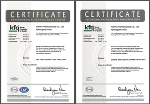 한미약품 평택공단은 최근 국제표준화기구(이하 ISO)가 부여하는 환경경영시스템(ISO14001)과 유럽지역 13개 표준화기관이 인증하는 안전보건경영시스템(OHSAS18001) 등 총 2건의 국제인증을 각각 취득했다(사진).