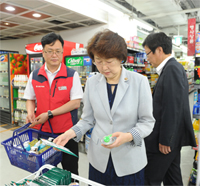▲김승희 식품의약품안전처장은 2일 중동호흡기증후군(메르스, MERS)로 인한 매출과 소비 감소로 인해 어려움을 겪고 있는 자영업자들의 애로사항을 청취하고 지원방안을 마련하기 위하여 그랜드마트 신촌점(서울 서대문구 소재)과 의약품 도매상 지오영(서울 서대문구 소재)을 차례로 방문했다(사진).