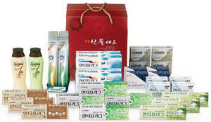 ▲부광약품은 추석을 맞이해 온 가족이 함께 사용할 수 있는 각종 생활용품을 풍성하게 담은 종합선물세트부터 치약세트까지 다양하게 준비했다(사진). 치약은 무(無)파라벤 치약으로 구성했다.
