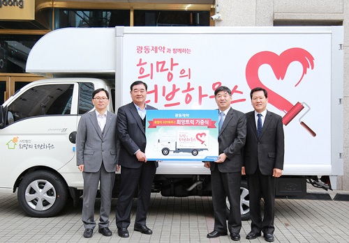 ▲광동제약은 무료 집수리 봉사단체인 '희망의 러브하우스'에 노후주택 보수에 필요한 1톤 트럭을 기증했다(아래 사진). 이 트럭은 향후 희망의 러브하우스가 봉사활동을 진행하는데 사용될 예정이다.
