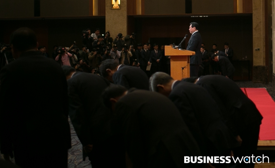 | ▲ 신동빈 회장 사과문 발표 신동빈 회장이 25일 서울 롯데호텔에서 사장단과 함께 사과 인사를 하고 있다. /이명근 기자 qwe123@ |