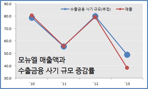 {모뉴엘은 정상적인 수출을 했다. 다만, 현금흐름이 좋은 편은 아니어서 수출에서 발생한 매출채권을 할인하는 방식으로 현금을 당겨 썼다. 매출과 수출채권 매각 금액이 같이 빠르게 늘긴 했으나, 미세하게 매출액이 더 많이 늘어난 것을 그렇게 해석할 수 있다. 그러나 2013년도부터 수출이 하락세로 돌아서면서 수출채권 매각액이 더 늘었다. 현금흐름은 더 빡빡해졌다. 올핸 더 견디기 힘들어지면서 결국 터졌다.}
