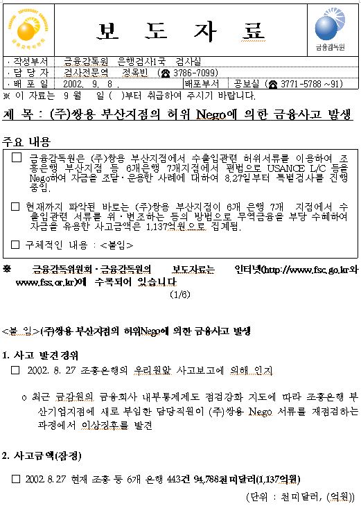 내용상 거의 차이가 없는 지난 2002년 ㈜쌍용 부산지점 무역금융 사기사건을 보자. 이 사건도 그룹이 어려운 시절에 ‘종합상사’를 통해 돈을 융통한 대표적인 사례로 꼽힌다. 금융감독원의 2003년 1월 10일 자 보도자료를 보면, ㈜쌍용 부산지점은 수출입 관련 서류를 위•변조하는 방법으로 유산스 L/C 등을 위법•부당하게 네고해 자금을 조달하다가 적발됐다.