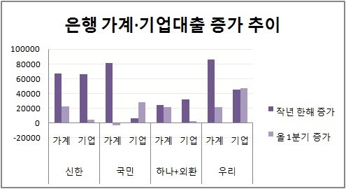 국민은행도 지난 한해 동안 기업대출을 6050억 원 늘렸는데 올해 들어 한 분기만에 2조 8646억 원 늘었다. 지난해 증가분의 5배에 가까운 증가액이다 .