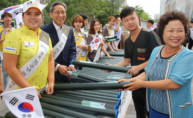 | ▲ 태극기를 나눠주는 윤종규 국민은행장(사진 왼쪽 두번째)과 박인비 선수(사진 왼쪽) |