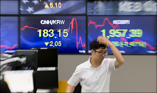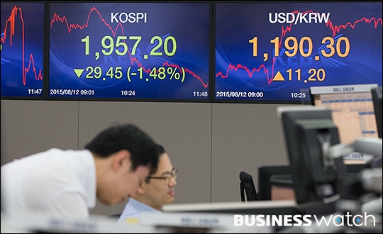 주식시장에도 불똥이 튀었다. 위안화가 기습 절하됐다는 소식이 전해지면서 코스피는 1950선대로 추락했다. 오후 1시43분 현재 1951.18로 전날보다 35.47포인트(1.79%) 떨어졌다. 코스닥 지수도 전날보다 36.19포인트(4.94%) 급락한 696.07로 700선 아래로 밀려났다.
