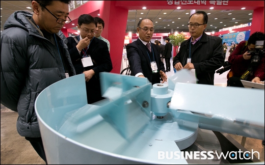 | ▲ 4일 오전 서울 삼성동 코엑스에서 열린 2013 대한민국 벤처.창업 박람회에서 융합안전기술단 드므가 일반 물소화보다 7배 강한 소화기능을 가진 압축공기폼을 선보이고 있다. |