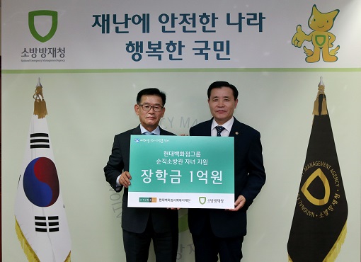 | ▲ 김영태 현대백화점 사장(사진 왼쪽)이 남상호 소방방재청 청장(사진 오른쪽)에게 순직소방관 자녀들을 위한 '파랑새 장학금' 1억원을 전달하고 있다. |
