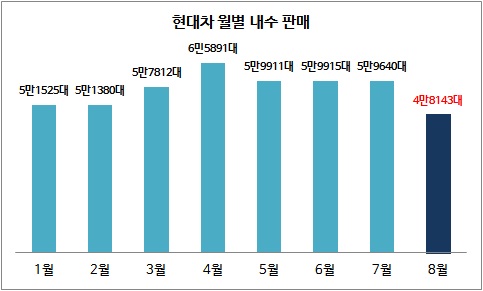 현대차의 지난 8월 내수판매는 올해들어 월별 기준으로 가장 저조한 판매실적이다. 지난 8월에 있었던 노조의 부분파업과 하계 휴가 등에 따른 영업일수 부족이 원인으로 꼽힌다.