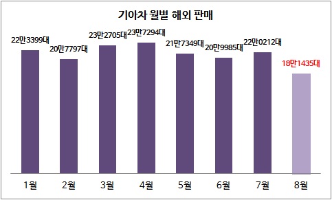 기아차의 8월 내수 판매는 올해들어 지난 7월 처음으로 4만대를 돌파했다가 다시 3만대 수준으로 내려왔다. 해외 판매의 경우 올해 들어 처음으로 월 판매 20만대를 하회했다.기아차의 판매 부진은 현대차와 마찬가지로 노조의 부분파업과 하계 휴가에 따른 것으로 보인다.