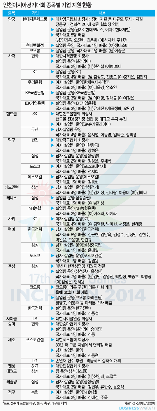 선수단의 목표 뒤에는 기업들의 지원도 적지 않았다. 전국경제인연합회가 집계한 결과, 우리 기업들은 출전종목의 절반을 넘는 20개 종목에 직간접 투자를 하고 있는 것으로 나타났다. 전용구장 건립과 장비구입 등 하드웨어부터 지도자 양성, 꿈나무 발굴 등 다양한 영역에서 지원이 이뤄지고 있다는 설명이다.