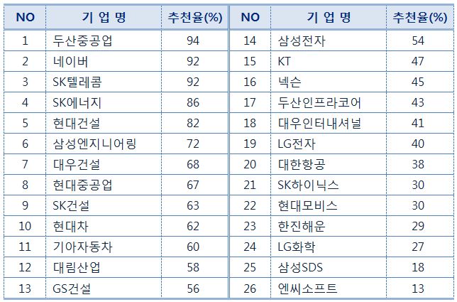 포털·게임업계의 추천율은 회사에 따라 천양지차다. 네이버는 92%로 높았지만 넥슨(45%)과 엔씨소프트(13%)는 바닥권으로 나타났다.