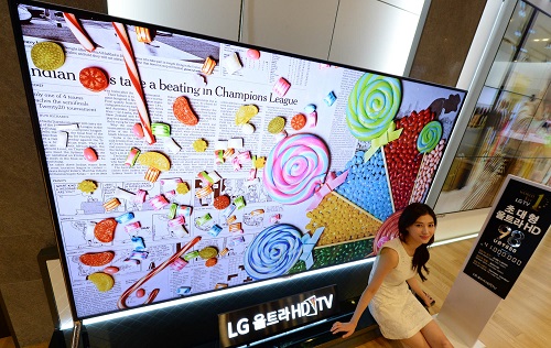 ◆LG전자가 8일부터 ‘98형 울트라HD TV’를 국내 시장에 출시한다. 이 제품은 너비 2.3미터, 높이 1.6미터로 49형 TV 4대를 이어 붙인 크기와 같다. LG전자는 울트라HD(3840×2160)해상도의 IPS 패널을 탑재해 더욱더 실감나는 영상을 즐길 수 있도록 했다. 이 제품에는 전원이 켜져 있을 때만 노출되는 5.2채널 120와트 ‘무빙 스피커’가 탑재됐다. 세계적인 음향기기 회사인 하만카돈(Harman kardon)과의 협업을 통해 전문가 수준의 음질을 구현했다. 캐쉬백 혜택을 통해 3900만원에 구입할 수 있다.