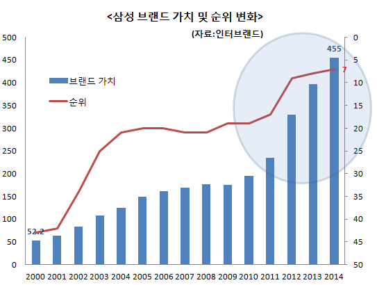 인터브랜드는 스마트폰과 커브드 TV 등 혁신적인 제품을 선보이며 시장을 주도했고, 메모리 사업의 매출 성장과 소비자 중심의 창의적인 마케팅 활동에 힘입어 브랜드 가치가 상승했다고 평가했다.