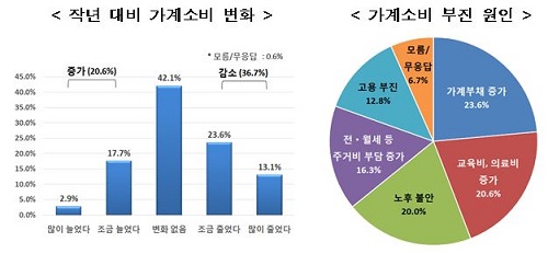 가계소비 부진 원인으로 ▲가계부채 증가(23.6%) ▲교육비․의료비 증가(20.6%) ▲노후 불안(20.0%)을 가장 많이 들었다. 다음으로 ▲전·월세 등 주거비 부담 증가(16.3%) ▲고용 부진(12.8%) 순으로 제시했다.