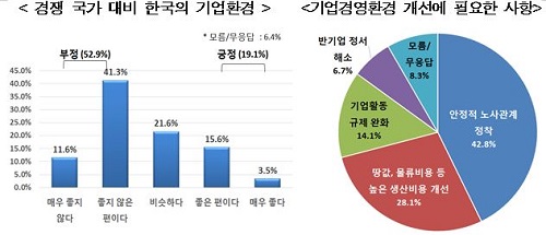 기업경영 환경에 대해서는 부정적으로 평가하는 의견이 많았다. ‘중국, 싱가폴, 일본 등 경쟁 국가들에 비해 좋다’는 의견은 19.1%로 나타난 반면, ‘좋지 않다’는 답변은 52.9%로 조사됐다.