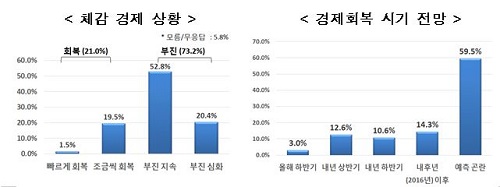 7명 이상은 경제에 대해 '부진이 지속되거나 심화되고 있다'는 인식을 가지고 있는 것으로 조사됐다. '회복되고 있다'는 의견은 2명 수준에 그쳤다.