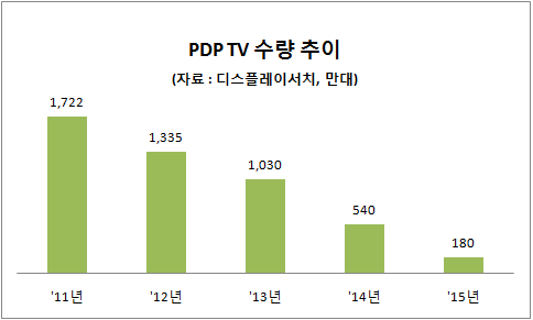 디스플레이서치에 따르면 세계시장에서 PDP TV 출하는 지난 2011년 1722만대에서 2012년 1335만대로 줄었고, 지난해에는 1030만대로 감소했다. 올해는 540만대 수준에 머물고, 내년에는 180만대에 불과할 것으로 예상됐다. 삼성SDI에 이어 LG전자의 사업철수로 PDP시대는 마침표를 찍었다.