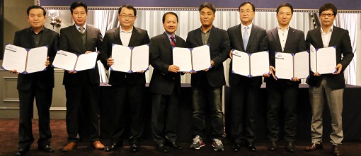 | ▲ 지난 4일 이랜드리테일은 서울 여의도에 위치한 렉싱턴 호텔에서 동반성장 협약식을 개최했다. 300여 브랜드의 협력사들이 참여한 가운데 이랜드리테일 김연배 대표이사(사진 왼쪽 네번째)와 협력사 대표 (주)제이앤드제이글로벌 유기현 사업부장이 '공정 거래 및 동반 성장 협약서'를 체결했다. |