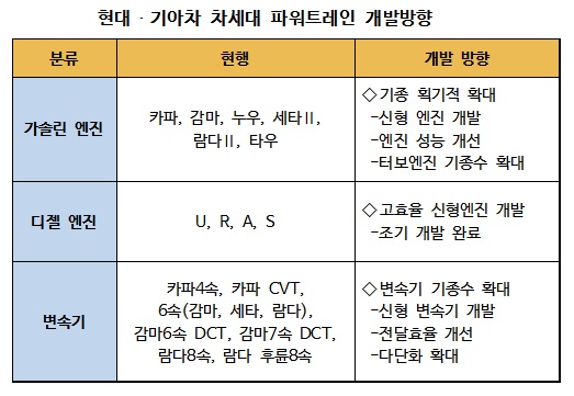 우선 가솔린 라인업을 강화한다. 신규 가솔린 엔진을 개발해 기종수를 확대하고 중형 승용차에 장착되는 누우 엔진과 소형차에 탑재되는 카파 엔진 개선 모델도 선보인다. 연비향상 효과는 물론 강력한 성능을 갖춘 터보엔진 개발도 확대한다.