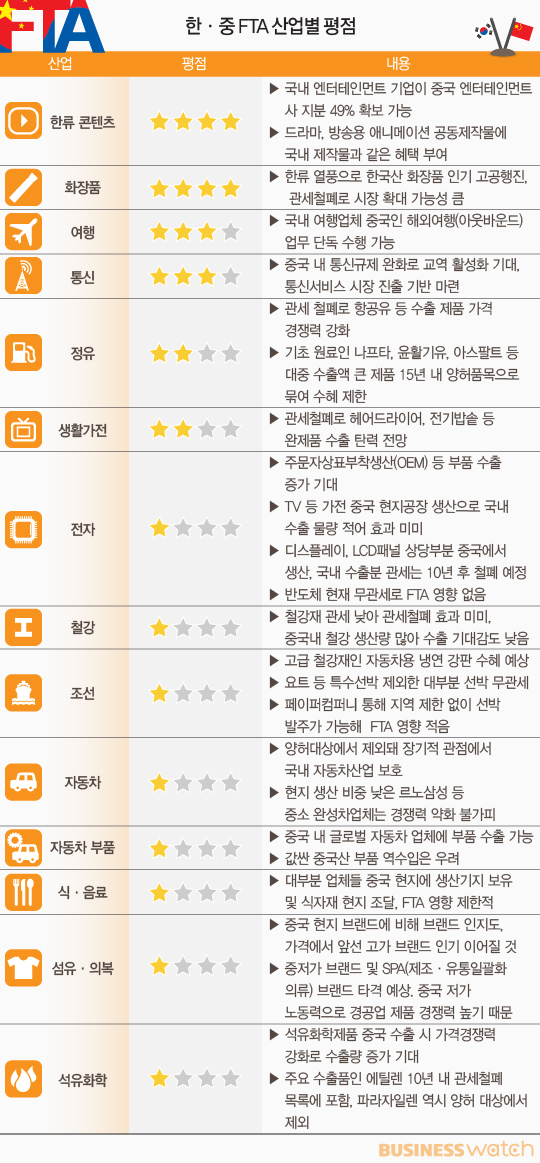 한-중 자유무역협정(FTA) 타결로 13억 중국 내수시장의 빗장이 풀렸다. 중국은 지금도 한국의 최대 수출국이자 수입국이지만 FTA가 발효되면 볼륨이 더 커질 전망이다. 하지만 업종별로 희비가 엇갈린다. 수혜가 예상되는 업종이 있는 반면 피해를 보는 업종도 있다. 업종별로 수혜정도를 별점으로 매겨봤다.