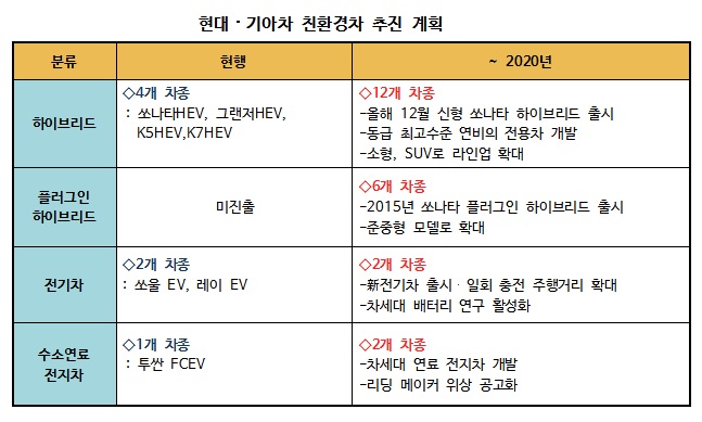 현대·기아차는 12일 오는 2020년까지 현재 7개 차종인 친환경차를 22개 차종 이상으로 확대하고 소형에서부터 SUV에 이르는 친환경차 풀라인업을 구축하겠다고 밝혔다.