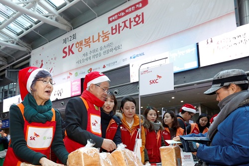 ◆SK ‘행복나눔바자회’가 4일 서울 용산역 실내광장에서 열렸다. SK가 저소득 가정의 난방비 지원을 위해 매년 여는 이 행사는 올해 12회째다. 이날 행사에는 최신원 SKC 회장을 비롯해 김재열 SK동반성장위원장, 이문석 SK동반성장위원회 위원, 김철 SK케미칼 사장, 정철길 SK C&C 사장, 조기행 SK건설 사장, 백석현 SK해운 사장, 김신 SK증권 사장, 김정근 SK가스 사장 등 SK CEO와 임직원, SK스포츠단 선수들이 참여했다. 국제구호단체 기아대책의 사회적기업인 (재)행복한 나눔과 경기사회복지공동모금회 자원봉사자 등도 함께 했다.