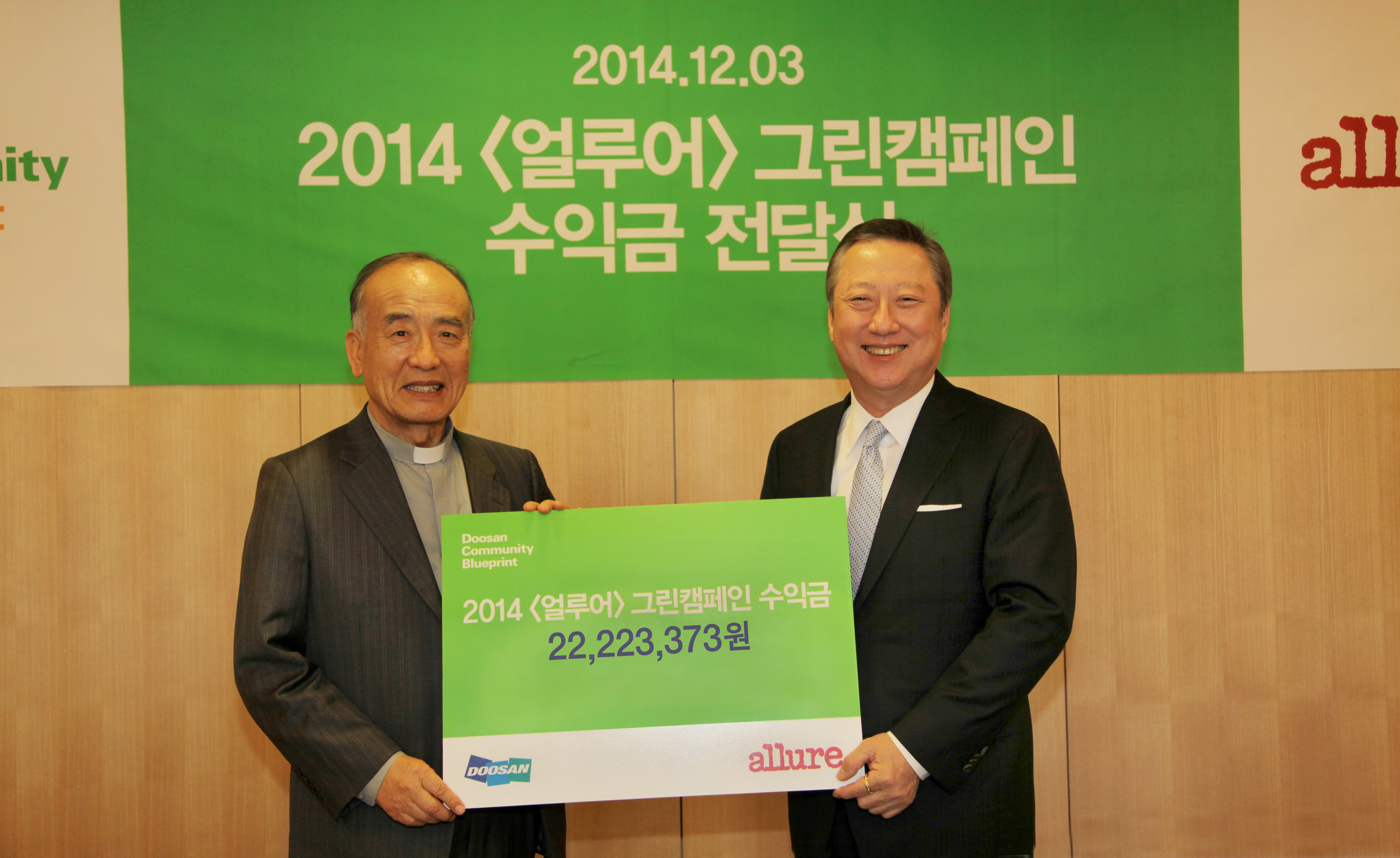 ◆ 두산매거진은 서울 중구 장충단로 두산타워에서 박경조 녹색연합 대표와 박용만 두산그룹 회장이 참석한 가운데 ‘얼루어 그린 캠페인’ 수익금 2200여 만원을 녹색연합에 전달했다고 4일 발혔다.
