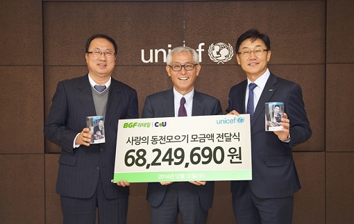 BGF리테일은 전국 8300여개 CU 매장에서 '사랑의 동전 모으기' 캠페인으로 모은 6800만원 가량을 유니세프에 전달했다. 박재구 BGF리테일 사장은 "고객들의 따뜻한 기부와 가맹점주의 적극적인 협조에 감사한다"며 "전국 네트워크 역량을 활용해 행복한 사회를 만드는데 더 많은 노력을 기울일 것"이라고 말했다.