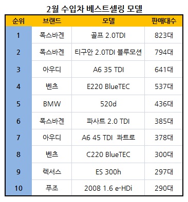 지난 2월 베스트셀링 모델은 폭스바겐 골프 2.0 TDI으로 총 823대가 판매됐다. 그 뒤를 폭스바겐 티구안 2.0 TDI BlueMotion(794대), 아우디 A6 35 TDI(641대) 등이 이었다.