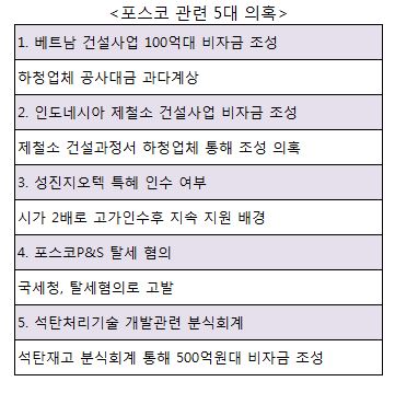 현재 검찰이 주목하고 있는 포스코그룹 관련 의혹은 크게 5가지로 전해진다.