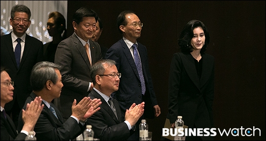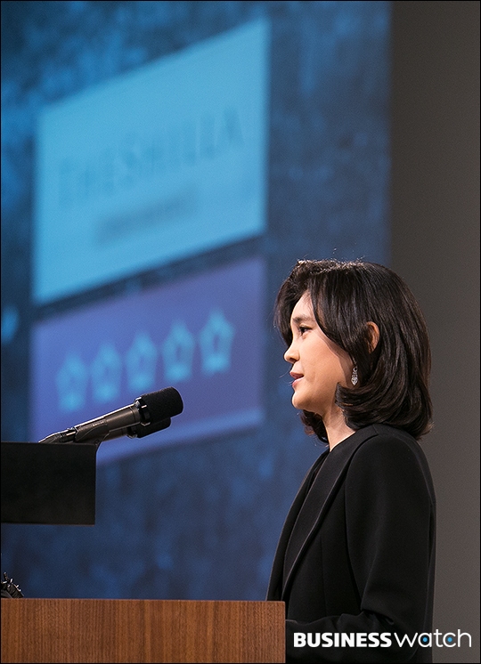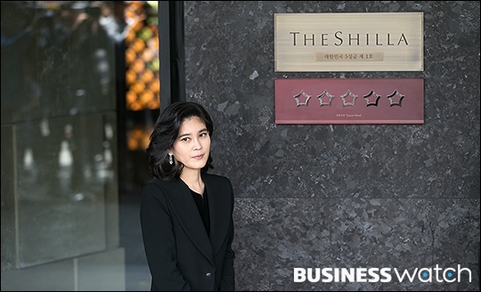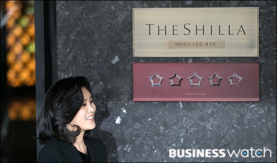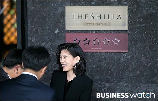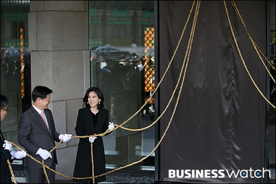 | ▲ 7일 서울 중구 호텔신라에서 열린 '국내 최초 5성급 호텔' 현판식에 참석한 이부진 호텔신라 사장이 현판 앞에서 미소짓고 있다. /이명근 기자 qwe123@ |