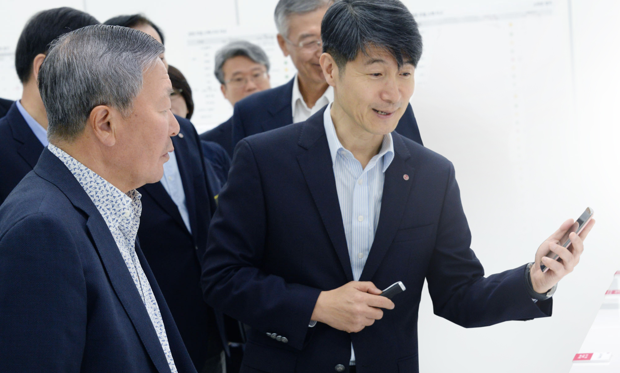 | ▲ 구본무 LG 회장(왼쪽)이 20일 LG전자 가산 R&D캠퍼스에서 최근 출시된 LG전자 전략 스마트폰 G4의 디자인과 UI(User Interface) 특징에 대해 조준호 LG전자 MC사업본부장(오른쪽)에게 설명을 듣고 있다. |