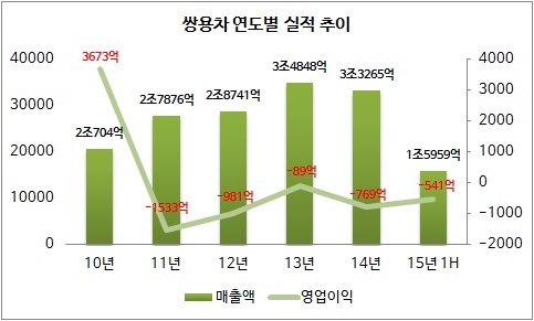 쌍용차는 지난 2011년 1533억원의 영업손실을 기록한 이후 2013년까지 매년 적자폭을 줄여왔다. 하지만 작년 다시 769억원의 손실을 입으면서 손실 폭이 커졌다. 하반기에도 지금과 같은 분위기가 이어진다면 쌍용차는 5년 연속 적자를 면치 못할 가능성이 높다.