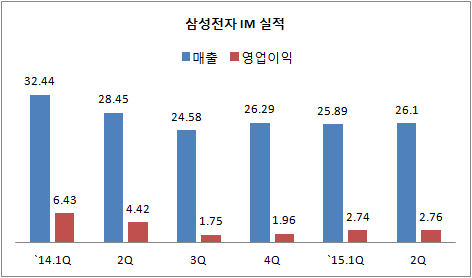 하지만 삼성전자가 내놓은 2분기 영업이익은 6조8979억원. 이중 IM부문 영업이익은 2조7600억원에 그쳤다. 1분기 IM부문 영업이익 2조7400억원과 비교하면 200억원 가량 늘어나는데 그쳤다. 갤럭시S6와 엣지모델의 판매가 시작됐지만 엣지모델의 공급 차질이 빚어지며 초기 수요 대응에 실패했고 마케팅 비용이 늘어났기 때문이다.