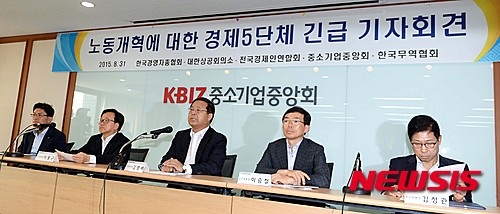 한국경영차총협회, 대한상공회의소, 전국경제인연합회, 중소기업중앙회, 한국무역협회 등 경제5단체는 31일 서울 여의도 중소기업중앙회에서 긴급 기자회견을 열고, 노동개혁에 대한 이같은 입장을 밝혔다.