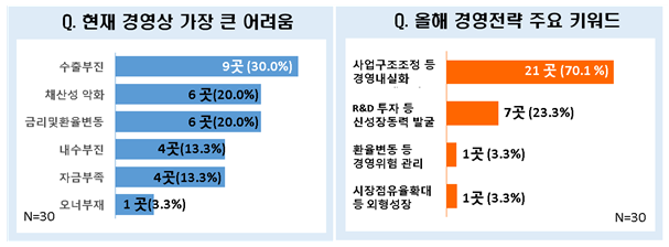 그룹들이 직면하고 있는 경영상 가장 큰 어려움은 수출부진(30.0%)과 채산성 악화(20.0%), 금리 및 환율변동(20.0%)인 것으로 조사됐다. 올해 중점 추진전략은 '사업 구조조정 등 경영내실화'(70.1%)를 가장 많이 꼽았고, ‘R&D투자 등 신성장동력 발굴(23.3%)’, ‘환율변동 등 경영위험 관리(3.3%)’ ‘시장점유율 확대 등 외형성장(3.3%)’ 등이 뒤를 이었다.