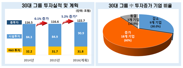 지난해 총투자는 당초 계획했던 125조9000억원의 92.6%에 그친 것으로 집계됐다. 작년 상반기 메르스 사태, 중국 경기둔화 등에 이어 하반기에도 중국발 경제쇼크, 세계경기 침체 등이 작용한 결과라는 분석이다.